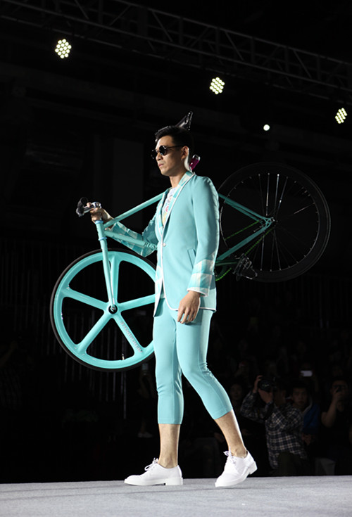 赢得创意设计奖的徐立豪同学,手捧白色鲜花,优雅的灰色系围巾,简约大气的白色风衣,符合了绅士低调奢华的高雅气质,我们仿佛可以看到一群潮男沐浴在玻璃建筑层叠反射的眩光之中,而这正是他的设计理念。