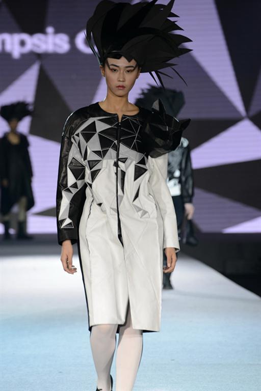 而设计师对于几何形的娴熟运用,也是其设计主题在整场发布会中得到了验证。设计使用倒叙的手法展现了从简单的黑白灰的平面几何图形,到构造色彩性十分丰富的立体几何图形的演化,同时在空间维度表现上运用皮草、在平面表现上运用皮革,使皮草服装除了展现传统意义上的华贵感,还体现出了不同层次上的时尚体验,极具表现力与视觉张力。这次的服装作品中还实验性地融入了现代3D打印技术,蔡凌霄以一种特立独行的蔡氏思维方式,来构 建年轻时尚的皮草服装造型,实现未来科技与传统皮草手工艺的完美结合。在整场秀的压轴阶段,设计师为我们带来了五套概念服装,其运用3d打印技术与传统材料的混搭,并使用了皮革在空间上的几何构造,设计出了诸多以动物元素为设计灵感的时尚单品。