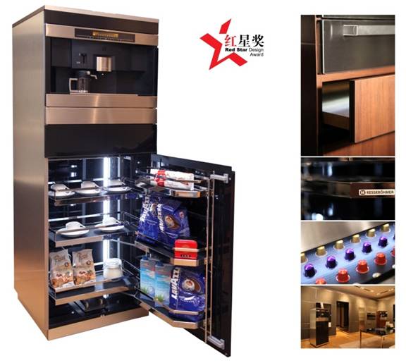 本获奖作品是由产品设计系吴翔、吴春茂、刘成等设计团队为德国凯斯宝玛(Kesseboehmer)公司设计的coffee box(咖啡小站)。从人的生活角度出发,喝咖啡逐渐成为中国人的一种时尚生活方式。为宾朋制作一杯精致的咖啡成了一种尊贵的礼仪,它可以随意移动至客厅、餐厅等不同地点进行这种迎宾礼。而它还提供了一个专业收纳解决方案,包含顶级咖啡机、茶具加热盘、咖啡胶囊收纳抽屉、联动拉篮等合而为一。感受设计之美,体验实用之便--这就是我们设计的咖啡小站。