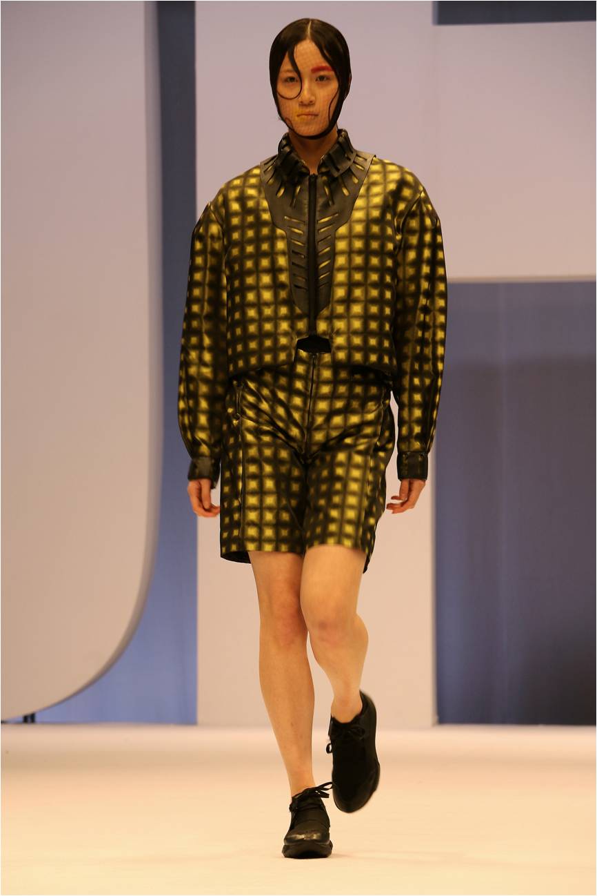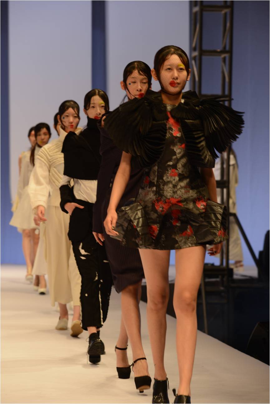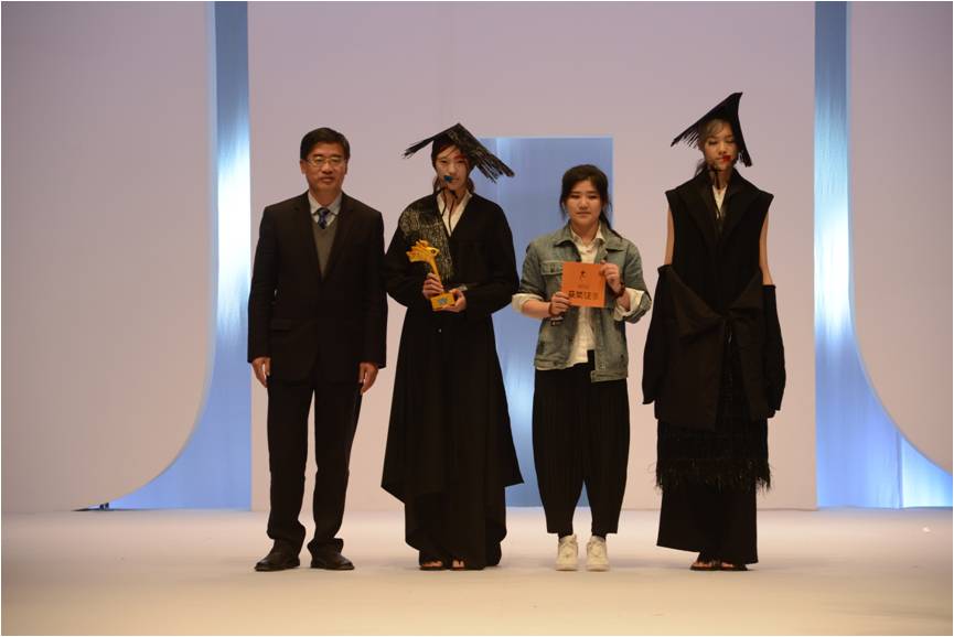 “2015雅莹东华杯”中日合作班毕业生作品秀紧随其后,一共展示了61套衣服。每件作品都是同学们三年国内学习,一年赴日学习的最终成果体现。当最后一件衣服随着灯光渐弱隐于后台,展演完毕。最激动人心的时刻到来了。评委们对学生作品进行了全方位的评审,评出铜奖三名、银奖两名、金奖一名。东华大学党委书记朱民教授,华之毅时尚集团总裁、浙江雅莹集团董事长张华明先生,浙江雅莹集团设计总监田玲女士,东华大学服装学院院长李俊教授,日本文化学园国际交流中心上海事务所所长、中日合作项目 日方代表林阳子分别为获得金、银、铜奖的学生们颁奖并合影留念。