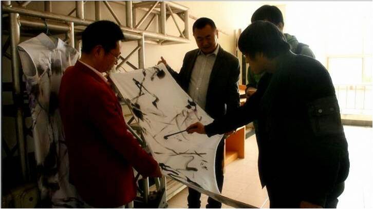 大写意系列的服装图案是胡伟达老师的即兴创作。在后台,我们有幸看到胡伟达老师的随心、淡然创作过程。更有童龄老师压轴出场走秀。
