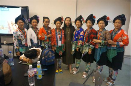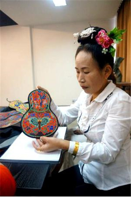 刘忠兰是贵州非物质文化遗产苗绣传承人,黔东南名匠。刺绣创意设计课程后,她非常高兴地跟大家分享她的刺绣作品,给大家讲述具体的刺绣工艺和手法。此次远道而来的她就是为了学习更多的新知识,今天的图案赏析课程给她带来了很多思考和启发。