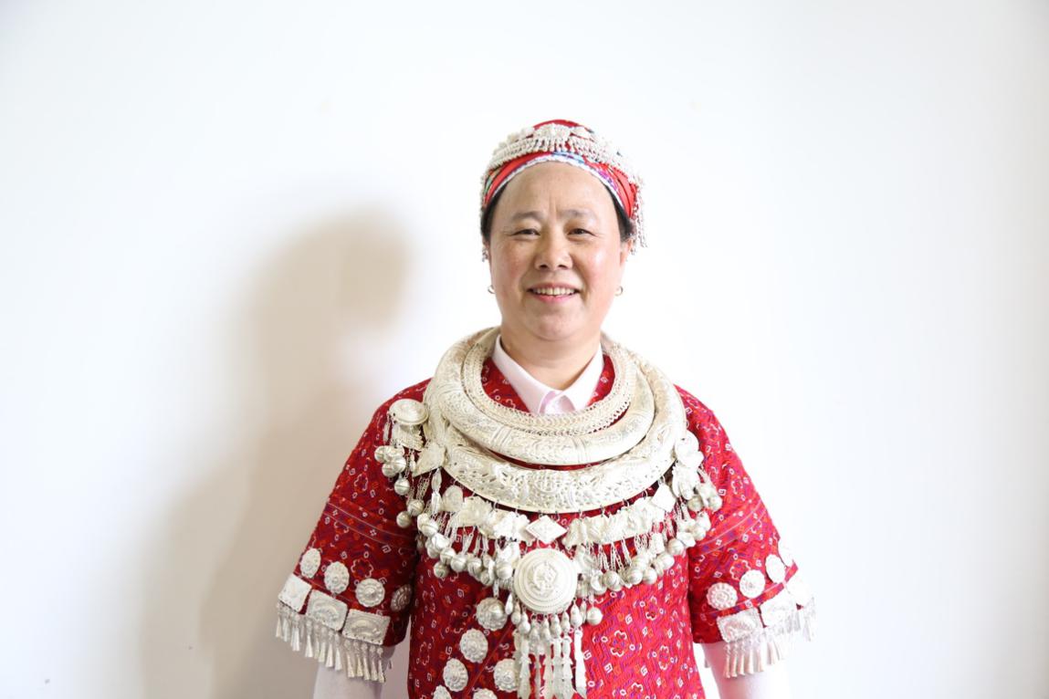 随后,我们采访了来自贵州省凯里市的学员杨光芝,身为非遗传承人,从10岁的时候就开始跟随母亲学习蜀绣,盛装出席的她身上所穿就是她亲手缝制的衣服。她谈到通过此门课程了解了一门新的刺绣工艺,不仅从历史、发展,而且从制作、材料、染色的环节都对绒绣有了相对深入的认知。而且刺绣的种类繁多,材料和各种技法多样,非常值得了解和学习。