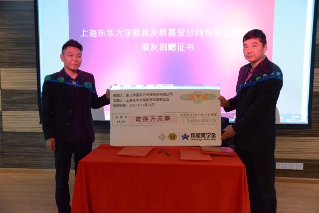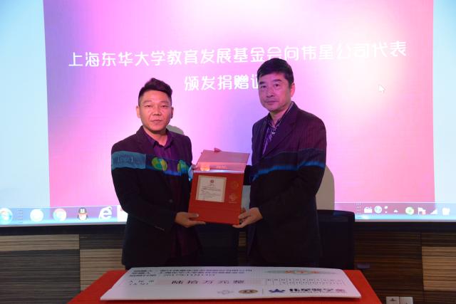 学校、学院领导和伟星公司代表为获得2016-2017学年“东华大学—SAB®伟星奖学金”的学生颁发证书。随后,伟星公司代表张玉明先生与学校代表瞿斌老师进行奖学金续签仪式。张玉明先生向上海东华大学教育发展基金会捐赠支票,瞿斌老师向伟星公司颁发捐赠证书。