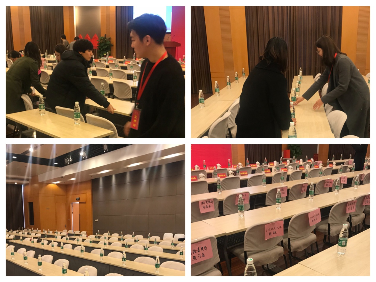 会议当天上午11:30志愿者们就来到了会议现场,跟随学会老师开展布置会场等工作,大家分工合作,从摆桌子到放置瓶装水,从放席卡到贴背贴,从搬运物资到分发礼品等等,两两分组,干的热火朝天。