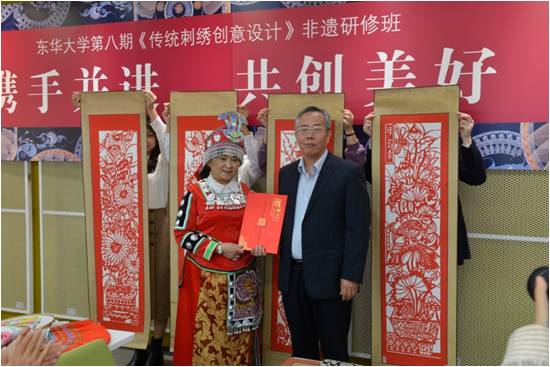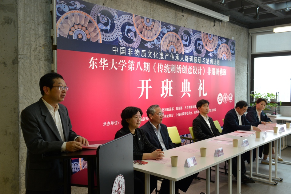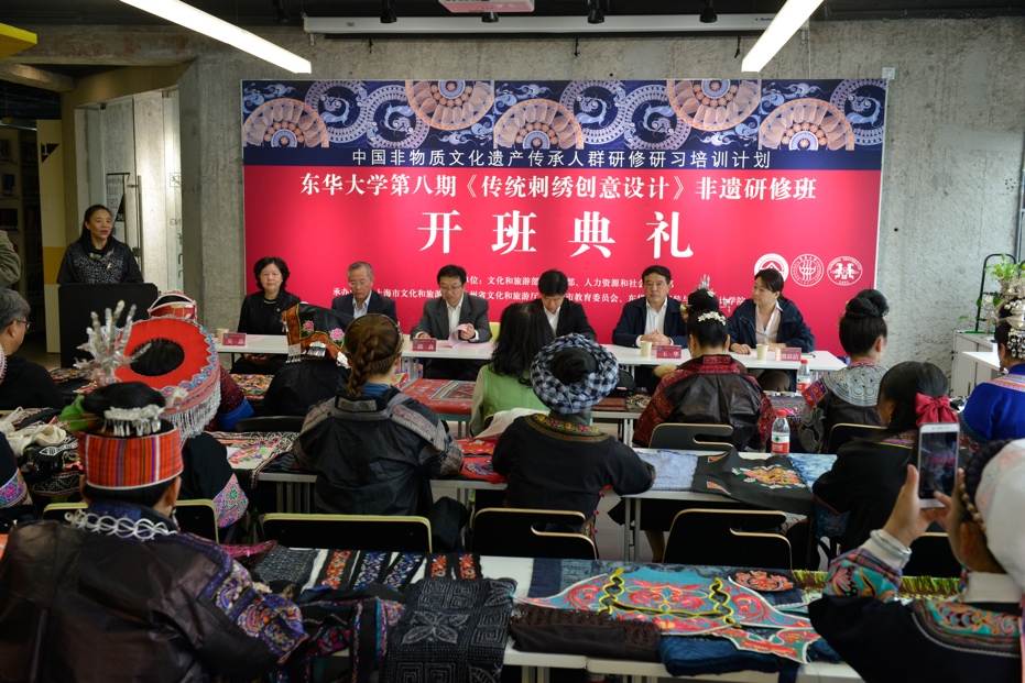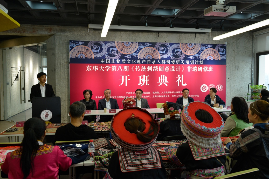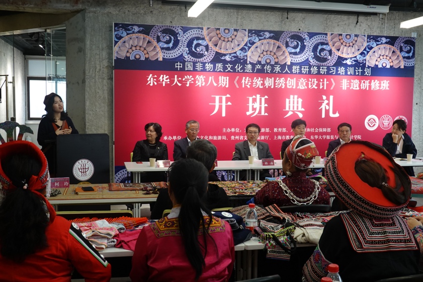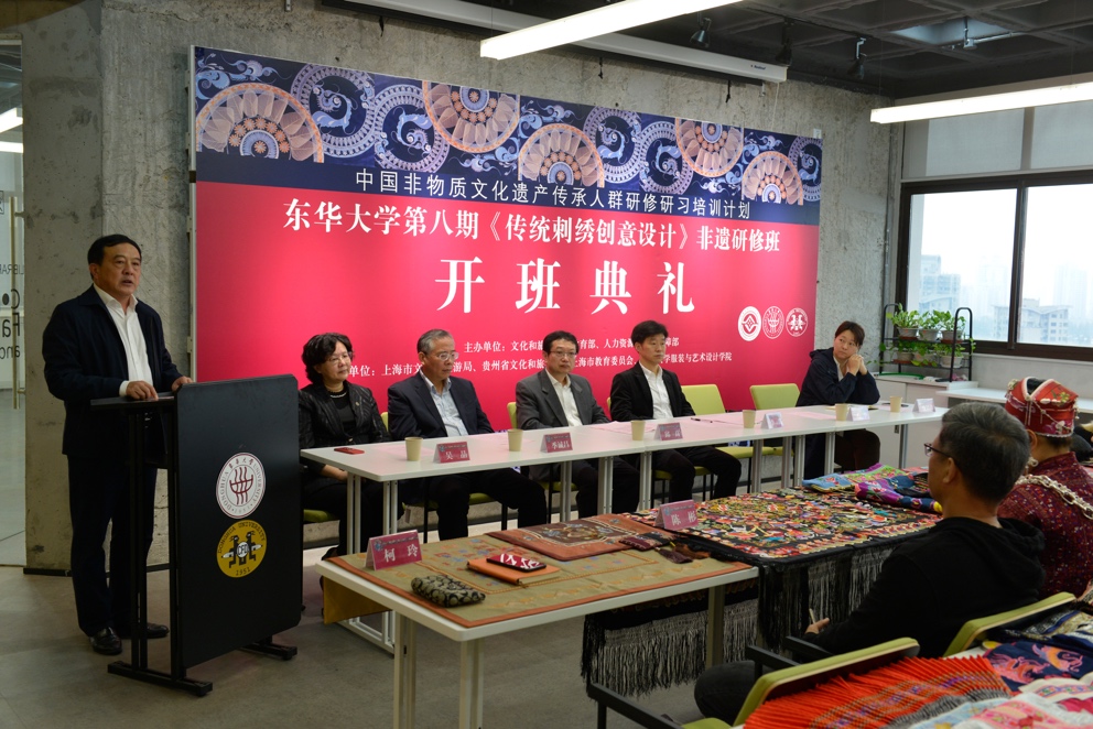 2020年10月20日,东华大学第八期中国非物质文化遗产传承人群研修研习计划“传统刺绣创意设计”研修班在延安路校区开班。东华大学副校长邱高、永利娱乐场 院长李俊、遵义市文体旅游局原副局长王华先生出席开班仪式并致辞,永利娱乐场 党委吴晶书记、东华大学科学研究院季诚昌处长、东华大学党委宣传部虞晨洁副部长等相关领导及部门负责人和全体非遗研修班学员一同参加活动。