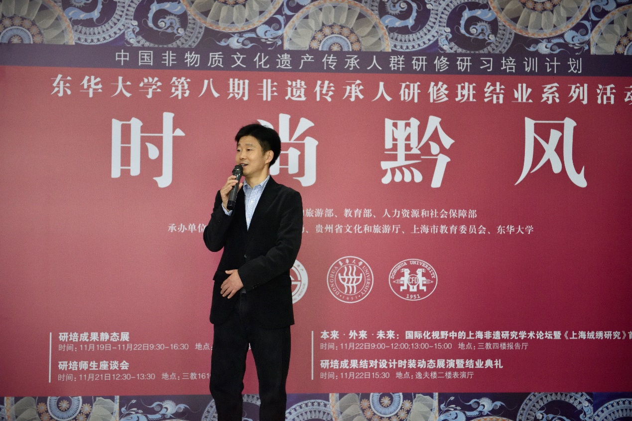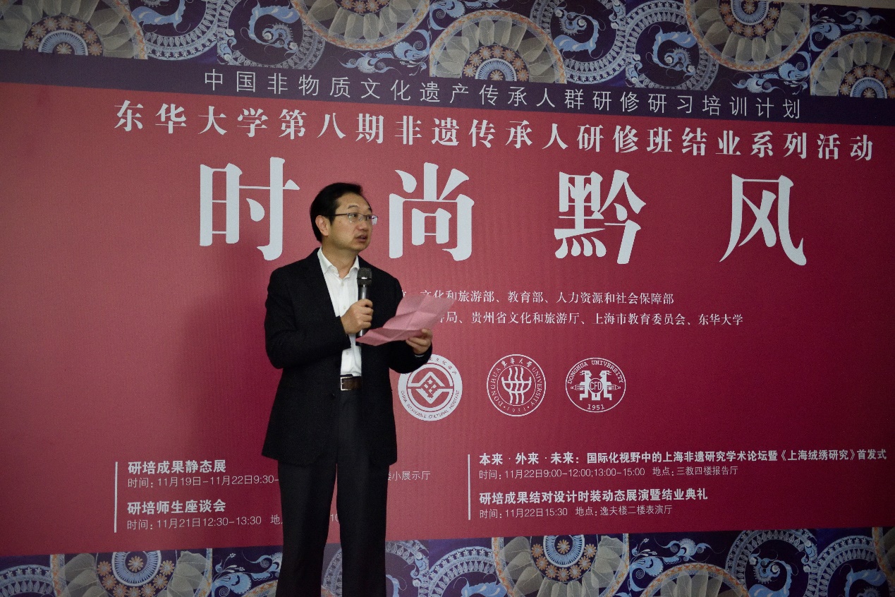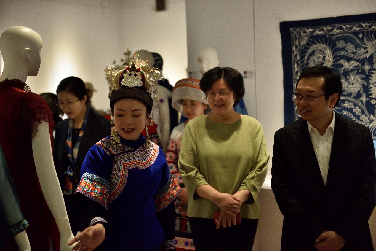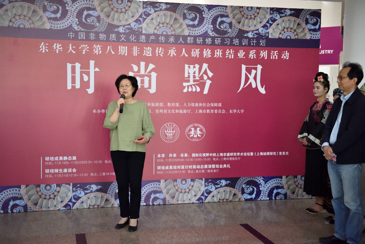 东华大学自20116年开办非遗研培以来,学校和学院的党委一直参与“文化扶贫”相关的各项活动,学校宣传部一直跟踪报道非遗传承人的“扶贫”事迹,学院党委吴晶书记更是身体力行在疫情结束初期亲自带队到云南楚雄回访非遗学员。学院党委吴晶书记致辞中希望,传承人们作为“使者”让贵州的民族文化与东华大学时尚设计学科的特色更好地结合起来,东华大学也将不遗余力地提供支持,让更多的非遗成果落地生根、开花结果,走出中国、走向世界。最后吴晶书记宣布“时尚黔风”东华大学第八期传统刺绣创意设计研修成果静态展开幕。