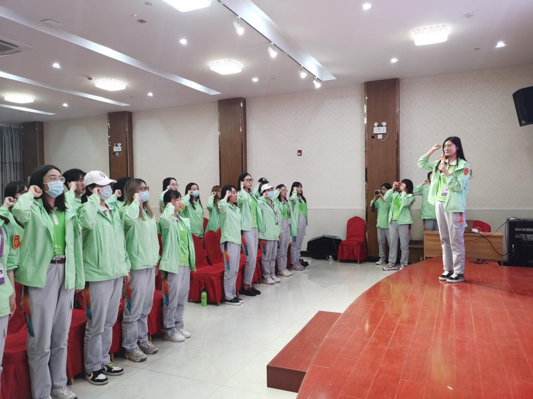 志愿者代表陆凌雨向同学们介绍了第十届中国花卉博览会的举办背景及时代内涵,以花博会志愿者主题曲MV《我的家是花》,带领志愿者一起回顾了开园以来的工作内容并分享交流服务心得,勉励志愿者们不忘初心,以良好的精神面貌和专业水平为花博会保驾护航。志愿者们结合“寻访红色印记”主题活动集体学习了园内的五处红色景点,分别是寓意“两个一百年”的两朵白玉兰、浙江园中的浙江南湖红船模型、江西园中的星火模型、上海园中的石库门建筑、陕西园中的“延安精神永放光芒”模型。通过讲述这些景点背后的党史故事,让同学们感受到中国共产党在带领中国从站起来到富起来到强起来的伟大征程。现场全体师生共同重温入团誓词,坚定服务信念。
