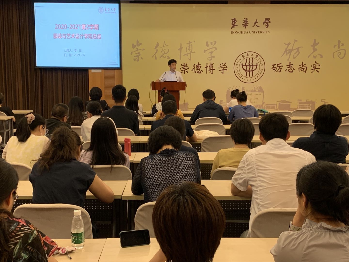 院长李俊表示,基于本学院学生多、学科多、生师比高的院情,建设“美好学院、时尚大家”的愿景,学院稳步朝向国内领先、国际一流的以服装科技与时尚设计为特色的艺术设计学院的目标迈进。他代表学院行政班子,全面介绍学科建设、师资队伍、人才培养、创研活动、办学条件、国际合作和社会服务等方面取得的工作进展和喜人成绩。他感谢全院师生的共同努力,鼓励大家再接再厉,争取在下半年工作中取得更大进步。