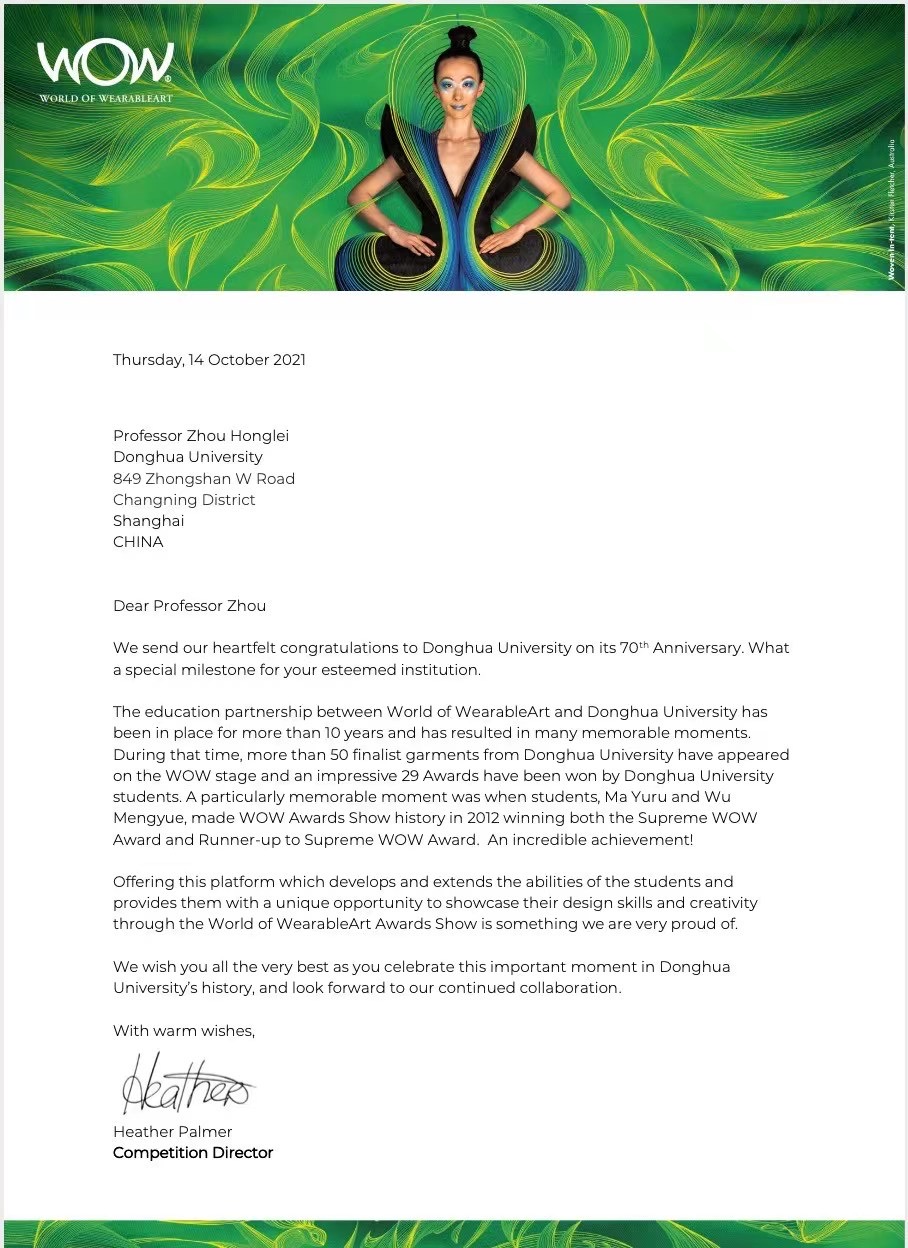 同时,令我校学子多次大放异彩的世界可穿着艺术大赛,其创始人兼赛事总监也向我校表达祝愿,