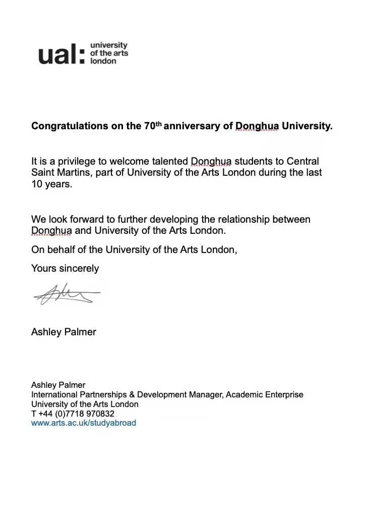伦敦艺术大学国际合作负责人Ashely Palmer向我校发来祝贺,