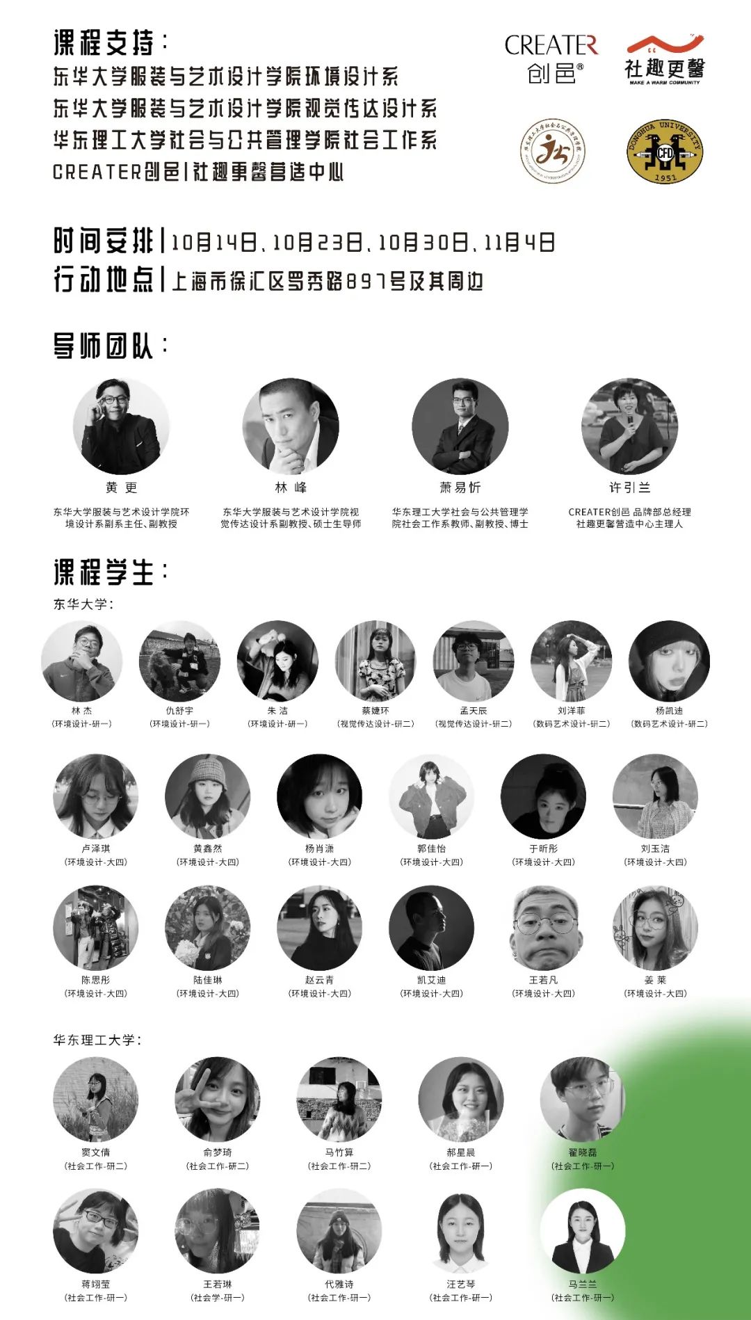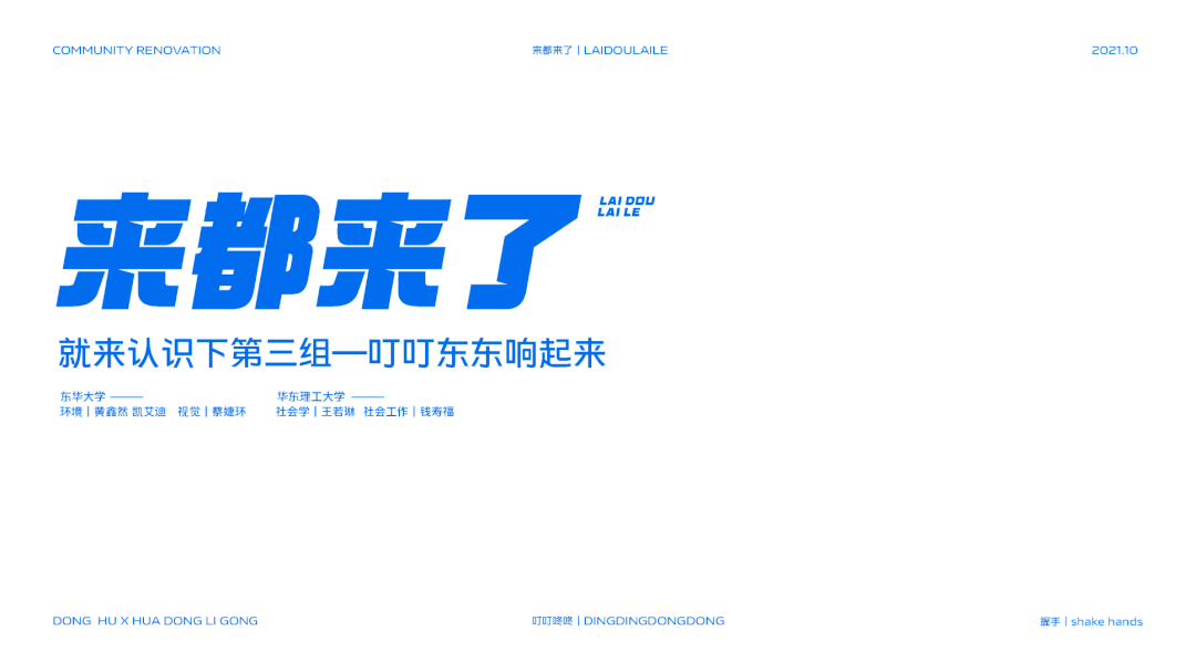 在我校环境设计系黄更副教授和视觉传达系林峰副教授的带领下,联合华东理工大学和城市更新运营商CREATER创邑,共同发起了此次课程实验行动,以校企深度合作、跨学科多元协作拓展课程实践与社会服务创新。华东理工大学社会工作系萧易忻副教授受邀加入此次课程,创邑·社趣更馨营造中心主理人许引兰担任校外导师,为课程提供专业指导。两校共32名本、硕、博学生参与了历时一个月的课程开展,以「握手」为意象促进不同群体间的交流合作与创造,挖掘并呈现城市街区的故事,培力跨界想象、构建共好社区。