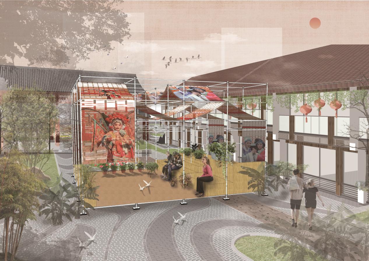 设计灵感来源于该地特有的码头、锡剧等文化元素,巧借景观节点将各个元素进行展现。场地右侧打造围合的合院空间,以特色流水铺装为主,并设置园林节点,欲将该地打造为集会、展览、互动、休闲一体的院落空间;建筑作为展览展示场地,展示锡剧文化、码头文化的历史发展;并在场地定制临时可移动装置,可变换三种形式,利用晾晒布匹的形式,展示锡剧元素,打造特色展示空间,活化围合场地,既作为村民集会活动空间,又可吸引外地游客了解当地文化。场地左侧打造开放滨水空间:将原本闭合的临水空间打开,因地制宜,利用码头的形式形成开放的滨水空间,并设置临水戏曲舞台,供当地居民游玩,并向外来游客展示锡剧文化,形成滨河小剧场,也开拓景观视野,增加人们的亲水性。建筑则作为体验当地非遗文化的场所。场地中间的部分建筑进行改造,将二层打造成观景阁楼,一层则是开放底层,连通左右两侧,巧借锡剧《红楼梦》一语双关,红楼复梦,梦为戏剧,楼为园景。