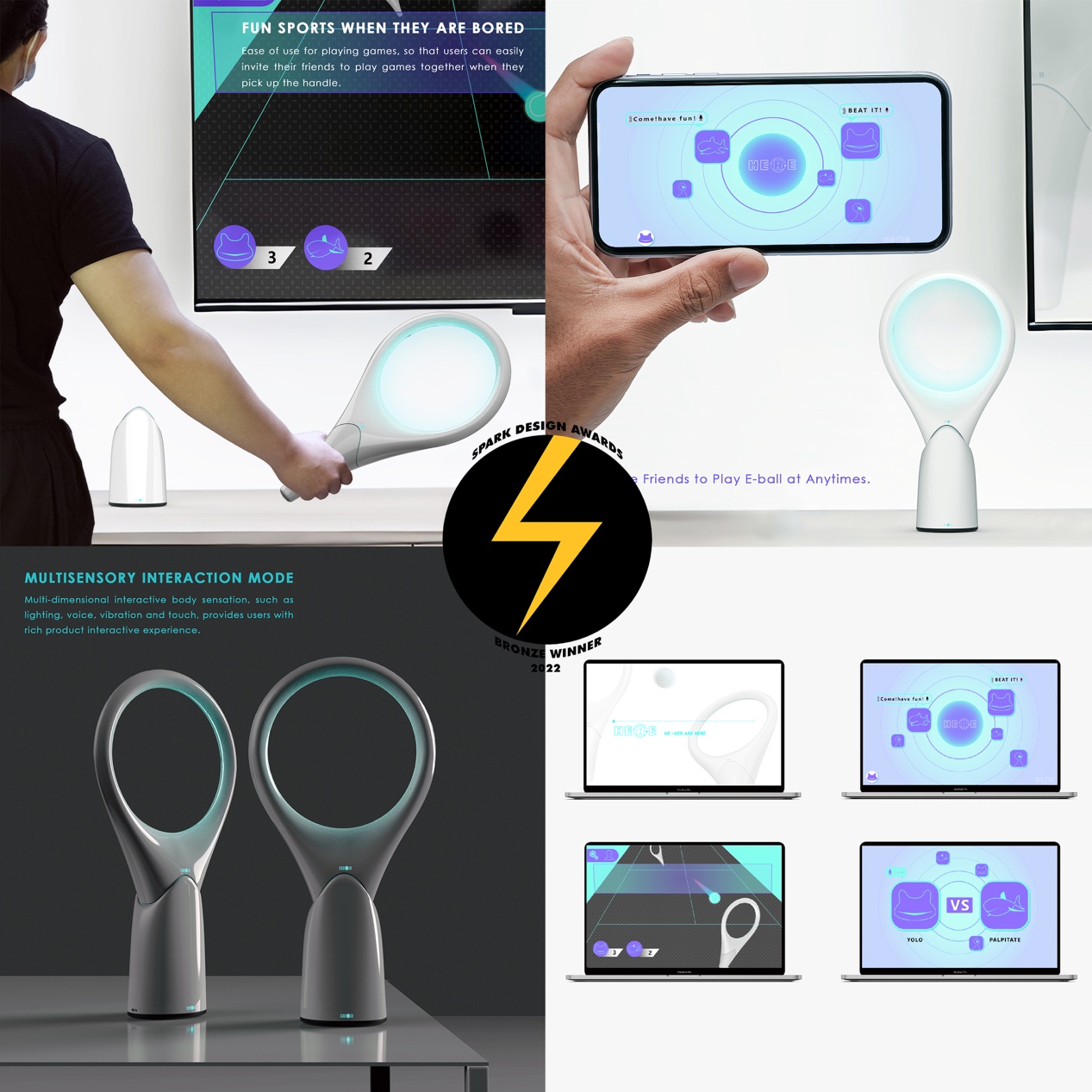 该设计灵感源于本轮新冠疫情下人们的现实困境。由于保持社交距离是遏制新冠病毒传播的有效手段之一,但对居家中的人们来说会产生孤寂、焦虑等负面情绪。这是一款运动游戏手柄,用于在自我健康管理期间缓解用户的消极情绪。它利用体感和无线网络技术实现室内运动和隔离区的互联。它不仅是一个用来满足人们的室内运动和社会交往需求的物联网球拍,也是一款温暖的陪伴小夜灯。它致力于将冷寂的隔离区变成一个欢乐、愉悦的运动室。
