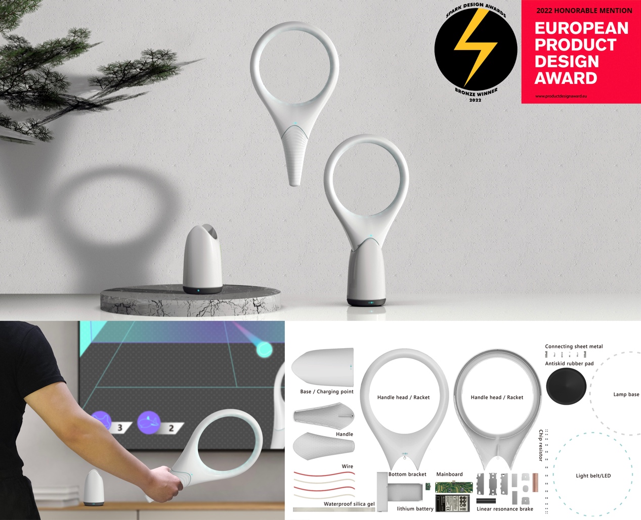 Here-Game Handle for Quarantine的设计灵感源于本轮新冠疫情下人们的现实困境。由于保持社交距离是遏制新冠病毒传播的有效手段之一,但对居家中的人们来说会产生孤寂、焦虑等负面情绪。这是一款运动游戏手柄,用于在自我健康管理期间缓解用户的消极情绪。它利用体感和无线网络技术实现室内运动和隔离区的互联。它不仅是一个用来满足人们的室内运动和社会交往需求的物联网球拍,也是一款温暖的陪伴小夜灯。它致力于将冷寂的隔离区变成一个欢乐、愉悦的运动室。本设计已获得2022年美国SPARK设计铜奖。