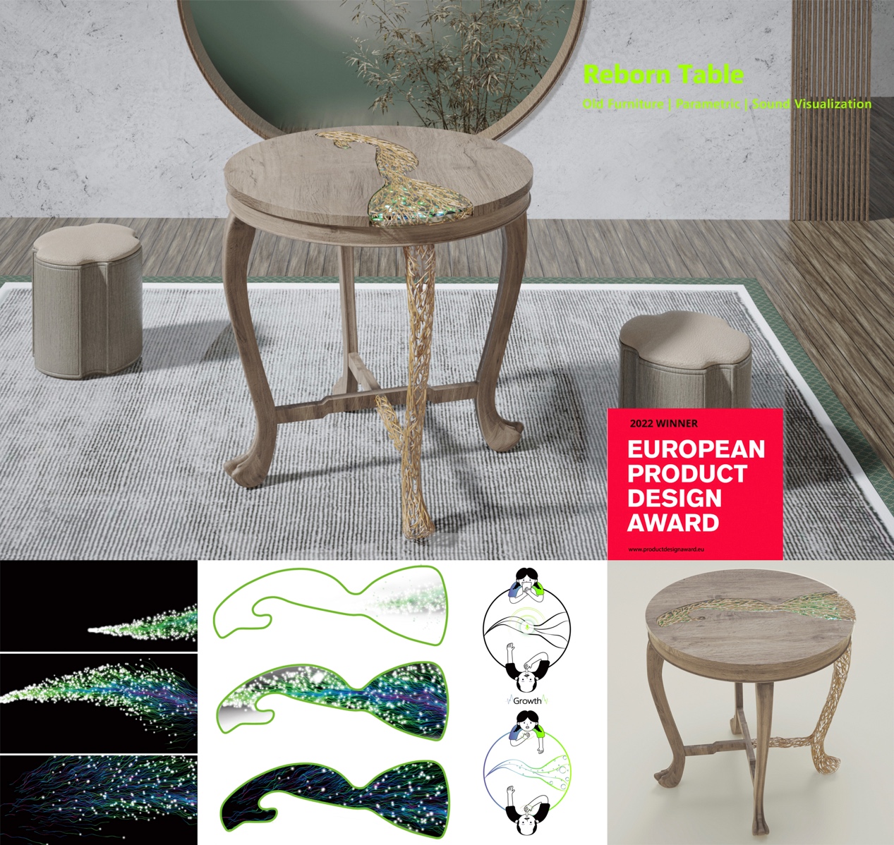 Reborn是一款促进代际互动的交流桌,其有三个维度的含义。功能层面:利用了参数化设计,对损坏的桌腿与桌面再设计,使其呈现树枝的生长纹理;识取声音而变化的动画部分采用“融球”的设计元素,两者结合形成一种“枯枝再春”的语义认知。形式层面:利用老物件结合新技术,赋予老物件全新视觉体验。情感层面:该设计承载着促进亲人间沟通交流的美好愿景,即家人间的感情通过老物件焕发新生。