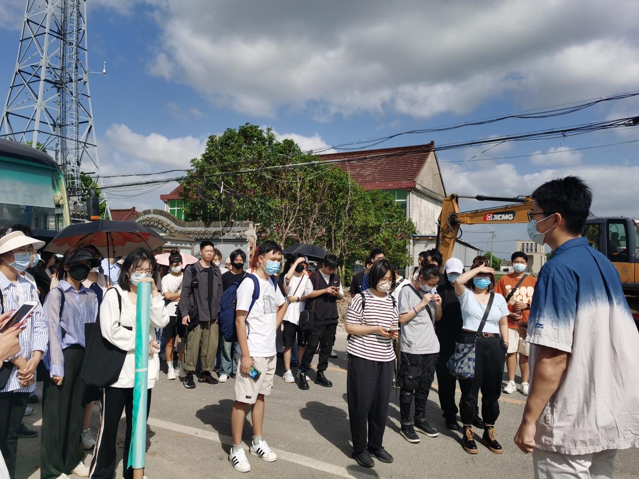 本次实地调研点位集中于枫泾镇五一村、韩坞村,当日上午调研团队于韩坞村村委会集合,先后考察村委会前主干道两侧设计点位以及村域宅前屋后菜园设计点位,韩坞村“韩世忠将军屯兵卫国”的悠久历史与爱国主义情怀,以及村民们自发进行的乡间田园改造工作都给来访师生们留下了深刻的印象。离开韩坞村后,调研团队前往“乐高乐园”的落户地——枫泾镇五一村,在村委及乐高乐园建设指挥部短暂停留并了解相关情况后,大部队前往大赛设计点位踏勘,藕塘水域及周边环境设计、村居一条埭宅前屋后环境设计、入村村牌设计、口袋公园设计以及仓库改造设计的空间设计点位题材较广、内容丰富,使专业师生们都不禁“见猎心喜”,在现场就“摩拳擦掌”地热烈讨论了起来。