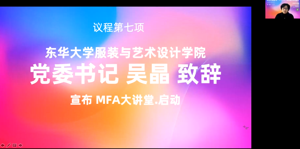 全国艺术专业学位研究生教育指导委员会委员、上海艺术专业学位研究生教育指导委员会秘书长冯信群教授与同学们深情回顾了东华大学MFA的发展历程。作为全国艺术硕士点首批试点单位之一,东华大学MFA中心在近20年的办学过程中取得了丰硕成果,在上海乃至全国的艺术硕士学位点建设中,发挥着示范引领的作用。以“美好学院、时尚大家”为发展愿景的永利娱乐场 ,欢迎新同学们加入,鼓励大家以“作品为背景”,奋发努力,学有所成。